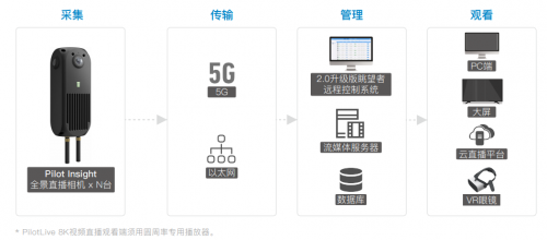 Pilot Insight全景直播相机直输4K /8K 360°全景画面,利用本地局域网、4G、5G等网络传输到观看端。用户可通过2.0升级版眺望者远程控制系统进行权限管理,全天候监控不同区域多台相机的实时运作情况和远程调整相机参数。
