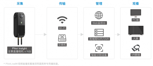 Pilot Insight全景直播相机直输4K /8K 360°全景画面,利用本地局域网传输到观看端。用户可通过Web监控台全天候监控同一区域多台相机的实时运作情况和远程调整相机参数。