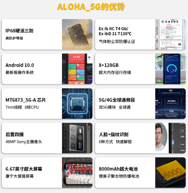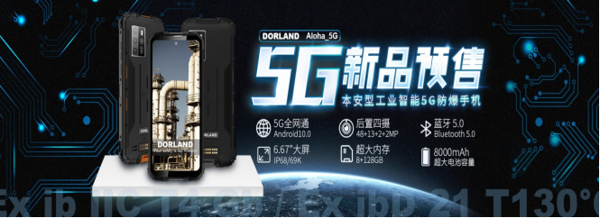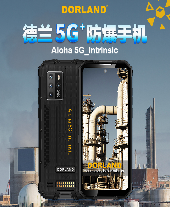 2021年3月份德兰即将推出第一款本安型工业级5G智能防爆手机Aloha_5G,此款手机采用5G先进技术,本安型电路设计、外观霸气、机身坚固、功能丰富且用途广泛。Aloha_5G支持5G/4G全球通、全频段,支持双卡双待,双5G模式,通过了国家气体和粉尘双防爆认证,国家3C证书,CTA 信产部入网证等,符合国际IP68的要求。