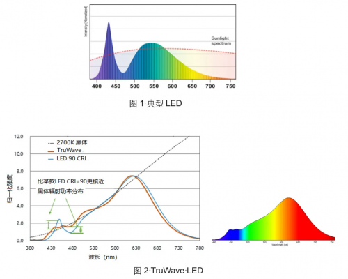 图1红色虚线为自然光的光谱,显示的光谱属于传统的LED,采用单蓝光激发源,蓝光波段有个大尖峰。可以看到LED光谱有些波段与自然光谱相差比较远。图2显示了2700k黑体,典型CRI90 LED和TruWave光谱。可以看到,与典型LED相比,TruWave的光谱与自然光很接近,能很好地呈现自然光的特性和效果。