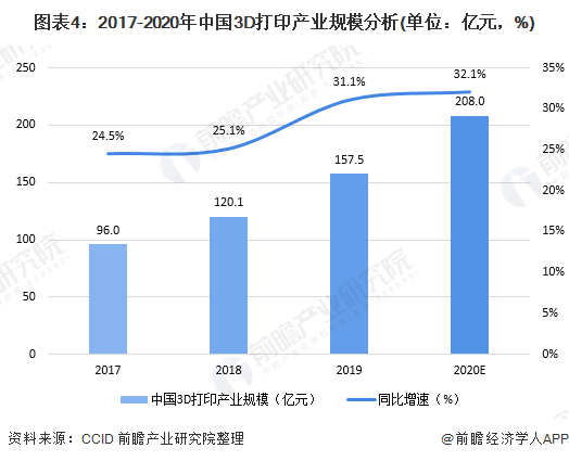 据2020年3月赛迪顾问发布的《2019年全球及中国3D打印行业数据》,2019年,全球3D打印产业规模达119.56亿美元,增长率为29.9%,同比增长增加4.5%。其中,中国3D打印产业规模为157.5亿元人民币,较2018年增加31.1%。