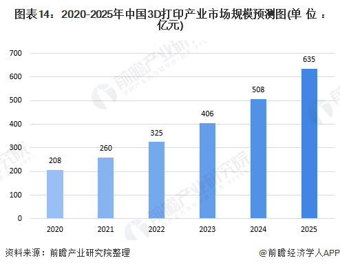 近年来,我国高度重视3D打印市场的发展,国家也不断出台政策进行产业扶持,我国3D打印产业市场规模不断扩大。结合国家层面政策指导以及国内近6年3D打印产业发展态势,前瞻预测2025年,我国3D打印市场规模将超过630亿元。由此可见,3D打印市场崛起,前景广阔。