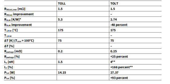 可以发现和TOLL封装相比较,TOLT最大的改进在于热阻降低非常明显整体耗散功提升超过90%以上。