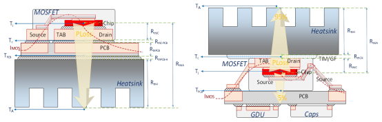 2,消除PCB和焊料互连来缩短散热通路,对MOSFET的性能提升具有显著影响。有实验对这两种方案进行了研究,结果显示:即使采用传统方案,使用FR4型PCB时,从结区到散热器的总热阻仍可至少降低20%。对于研发工程师而言,这意味着要么在相同功率应用下节省冷却系统成本,要么通过相同系统架构实现更高功率输出。