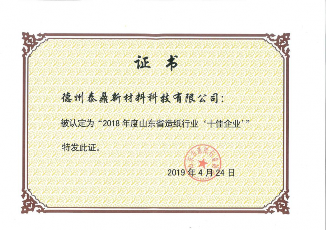 2019年4月荣获山东省2018度造纸行业十佳企业